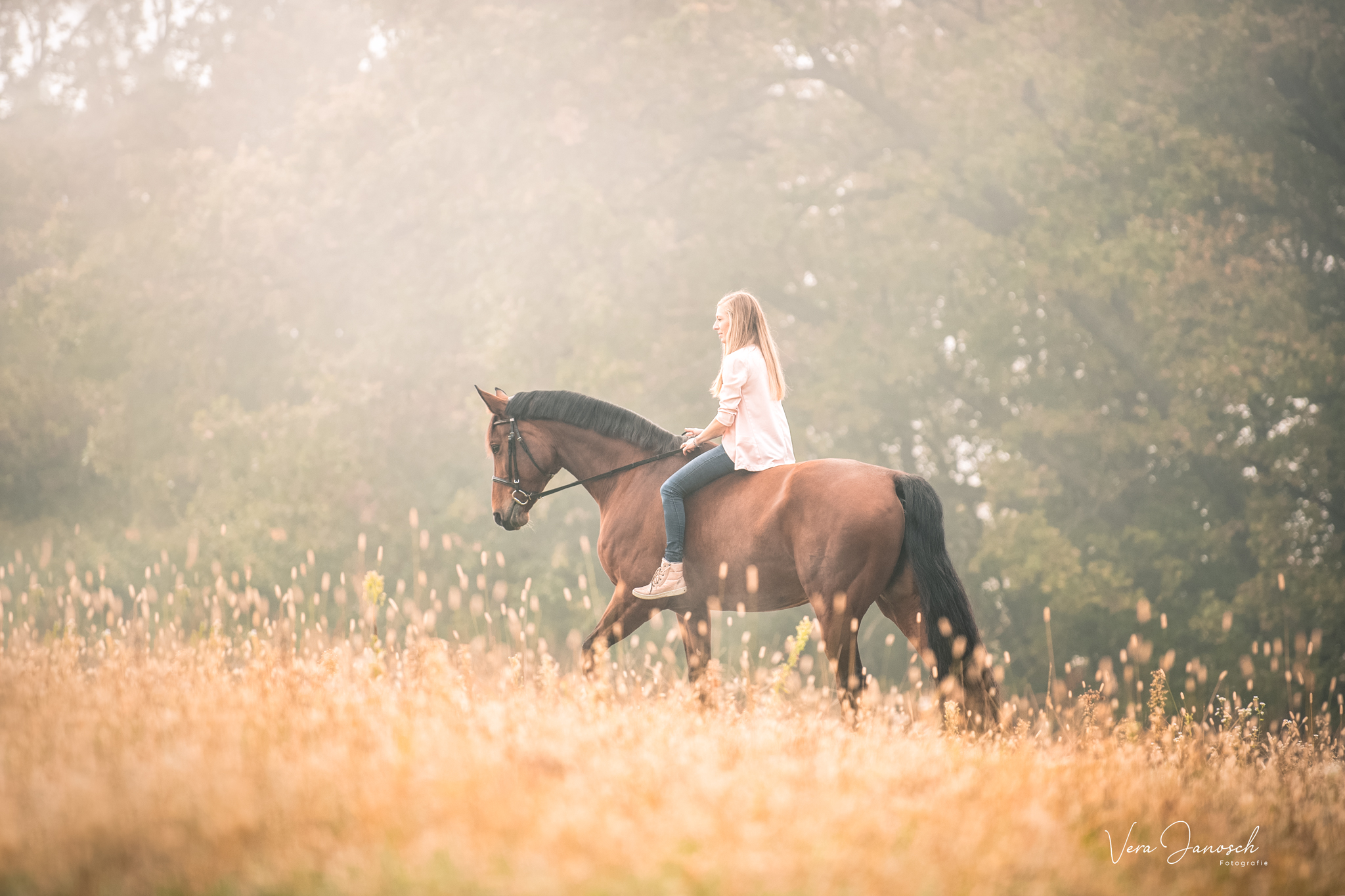 Oft reicht es auch schon, sich einfach ohne Sattel auf sein Pferd zu setzen und den Blick ein bisschen durch die Gegend schweifen zu lassen. Allein dabei entstehen oft sehr schöne Momente zwischen Reiter und Pferd. Seid also nicht gehemmt, Reitbilder von euch machen zu lassen, nur weil ihr keine Turniere auf hohem Niveau startet oder eure Pferde am Halsring reiten könnt - schöne Reitbilder leben von der Stimmung und eurer Harmonie mit dem Pferd.